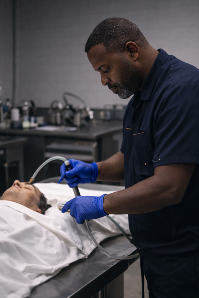 APEX Deathcare Services LLC delivers behind-the-scenes technical excellence for licensed funeral homes and deathcare professionals. Every service is performed with precision, regulatory compliance, and respect for the individual entrusted to our care.